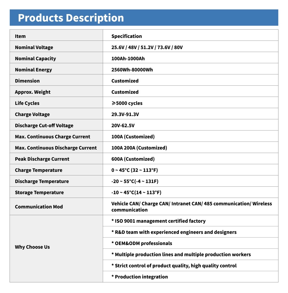 Batería de litio para montacargas de 73,6 V y 410 Ah con sistema de gestión de batería inteligente (BMS) y batería LiFePO4.